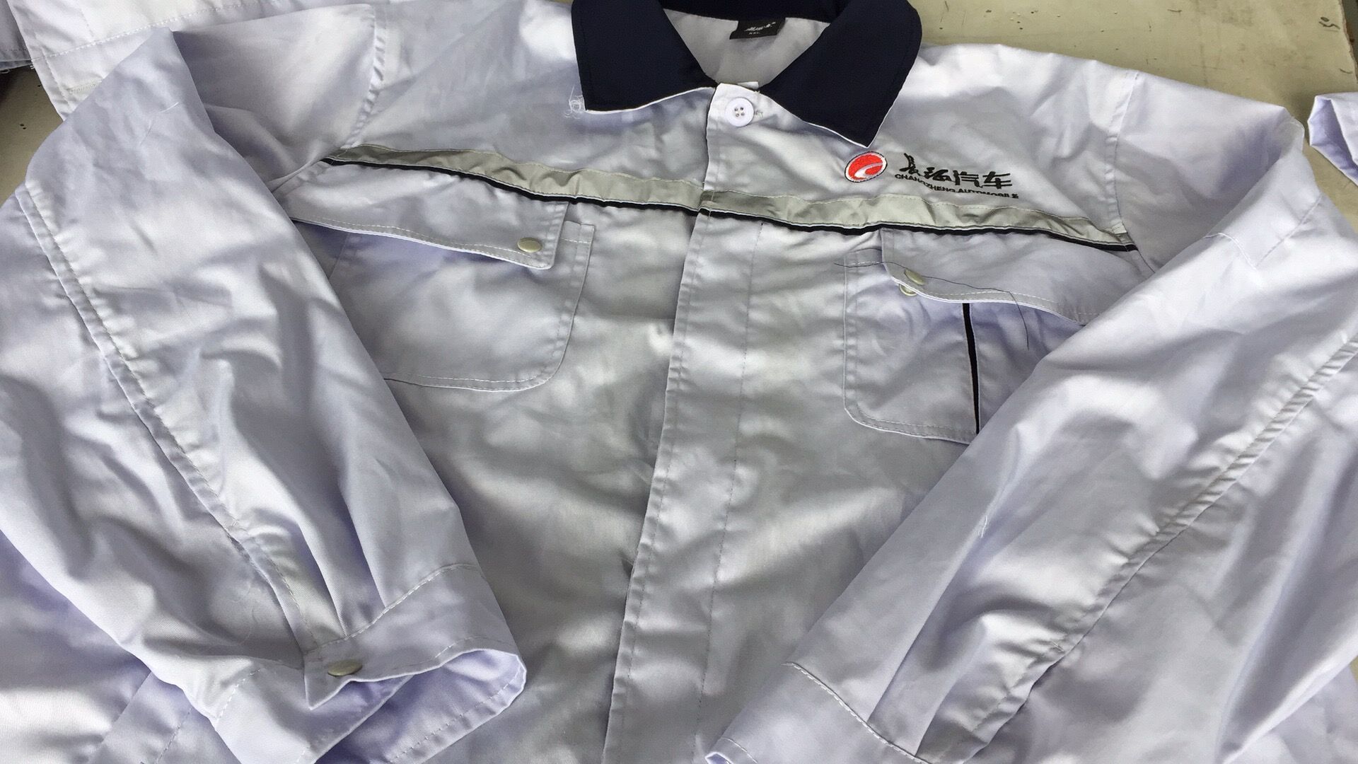 河北长征汽车是一家汽车制造公司。内有员工叁佰多人。每年夏季都要开始定做夏季工作服。夏季工作服分为两种,短袖和长袖。夏季长袖工作服的款式和短袖保持一致。只是袖子长度的区别。目前款式已经确定,产前样已经出品。采用了非常浅的灰色面料拼藏青色的款式。款式图片如下:
